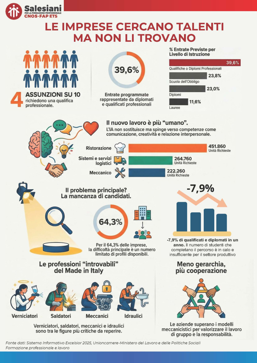 Il Sistema Informativo Excelsior 2025 di Unioncamere-Ministero del Lavoro conferma una tendenza consolidata: nel 2025 le imprese italiane prevedono di assumere circa 2.300.000 persone con qualifica o diploma professionale, pari al 39,6% del totale delle entrate programmate. Un dato che supera nettamente i diplomi scolastici quinquennali (23%) e le lauree (11,6%).