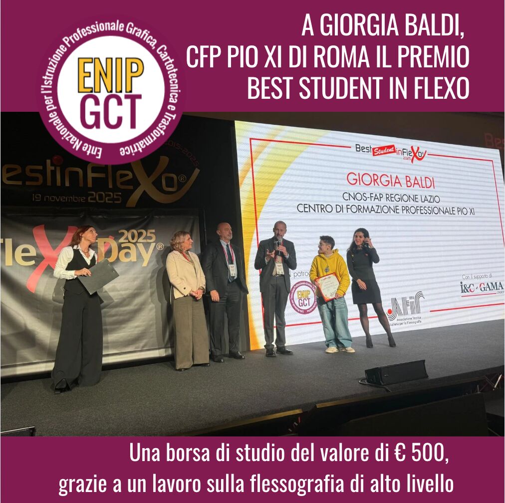 Ci sono momenti in cui il talento e l'impegno si incontrano, producendo risultati straordinari. È quello che è successo a Giorgia Baldi, studentessa del terzo anno del CFP Pio XI di Roma, che il 20 novembre scorso a Milano ha conquistato il Premio BestStudentInFlexo 2025, portando a casa una borsa di studio di 500 euro.